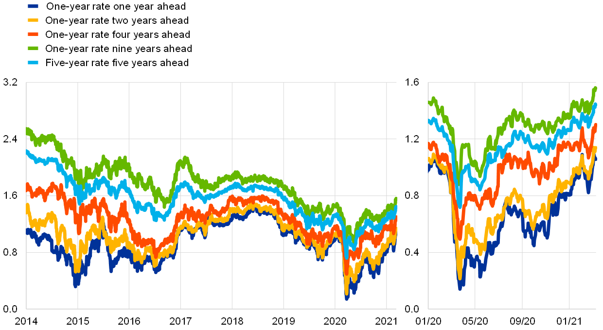 The EONIA forward curve shifted upwards over the review period, especially at long horizons, and also became steeper (Chart 4). The mild inversion of the curve at short-term maturities that was visible in the path prevailing in December has disappeared in an environment of more favourable sentiment towards the recovery. The trough of the curve, which is 2 basis points below the current EONIA level of -50 basis points, corresponds to April 2022. The curve thus indicates that financial markets are not pricing in an imminent rate cut. Overall, EONIA forward rates remain below zero for horizons up to mid-2026, reflecting continued market expectations of a prolonged period of negative interest rates.