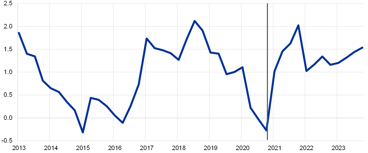This box examines the latest developments in the euro area stock of capital and its main drivers. More specifically, it discusses the role played by investment and the depreciation and retirement of fixed assets in explaining capital stock developments. It also shows the extent to which recent developments are similar to those experienced during the great financial crisis and the subsequent euro area sovereign debt crisis.[16] The analysis relies primarily on European Central Bank (ECB) quarterly estimates of capital stock, which are based on a constrained optimisation model using annual data from Eurostat (with a lag of two years) and temporal disaggregation techniques.[17] Therefore, especially the recent data and analysis should be considered with caution and may be subject to significant revisions in the future.