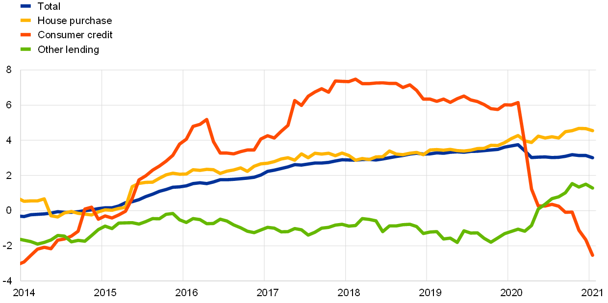 Monetary dynamics in the euro area continued to reflect the impact of the coronavirus pandemic. Broad money (M3) growth stood at 12.5% in January 2021, after 12.4% in December and 11.0% in November 2020. Strong money growth continued to be supported by the ongoing asset purchases by the Eurosystem, which remain the largest source of money creation. In the context of a still heightened preference for liquidity and a low opportunity cost of holding the most liquid forms of money, the narrow monetary aggregate M1 continues to be the main contributor to broad money growth. Developments in loans to the private sector were characterised by somewhat weaker lending to non-financial corporations and resilient lending to households. The monthly lending flow to non-financial corporations continued the moderation observed since the end of the summer. At the same time, the annual growth rate of loans to non-financial corporations remained broadly unchanged, at 7.0%, after 7.1% in December, still reflecting the very strong increase in lending in the first half of the year. The annual growth rate of loans to households remained broadly stable at 3.0% in January, after 3.1% in December, amid a solid positive monthly flow. Overall, the Governing Council’s policy measures, together with the measures adopted by national governments and other European institutions, remain essential to support bank lending conditions and access to financing, in particular for those most affected by the pandemic.