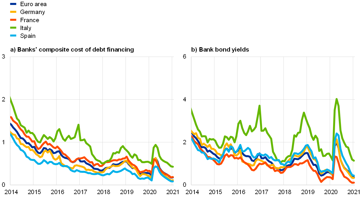 Notes: The composite cost of deposits is calculated as an average of new business rates on overnight deposits, deposits with an agreed maturity and deposits redeemable at notice, weighted by their corresponding outstanding amounts. Bank bond yields refer to monthly averages of senior-tranche bonds. The latest observations are for January 2021.