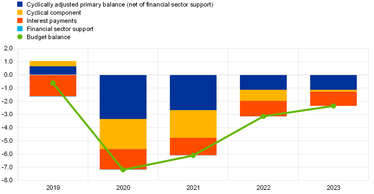 The aggregate fiscal stance was highly expansionary in 2020 and should be broadly neutral in 2021 after adjusting for the expected revenue-increasing impact of countries’ receipt of NGEU grants. The fiscal stance is estimated to have been highly accommodative, at 4.2% of GDP, in 2020. In 2021 it is still projected to be broadly neutral, after adjusting for NGEU grants on the revenue side.[14] The expected tightening of the fiscal stance from very high levels of support will thus be postponed to 2022 (amounting to 1.5 percentage points of GDP), followed by neutral developments in 2023 in a no-policy change scenario building upon the measures taken into account in the projections. This notwithstanding, the level of fiscal support to the economic recovery remains large over the projection horizon, as reflected by the overall primary fiscal balance remaining substantially negative, improving only gradually to -1.3% of GDP in 2023.