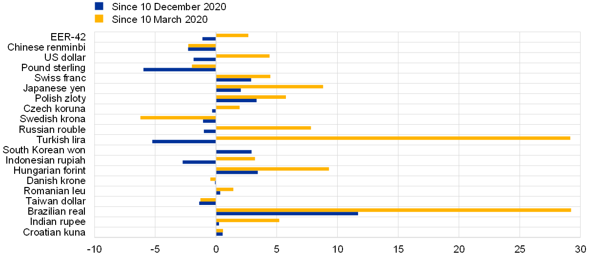 Notes: EER-42 is the nominal effective exchange rate of the euro against the currencies of 42 of the euro area’s most important trading partners. A positive (negative) change corresponds to an appreciation (depreciation) of the euro. All changes have been calculated using the foreign exchange rates prevailing on 10 March 2021.