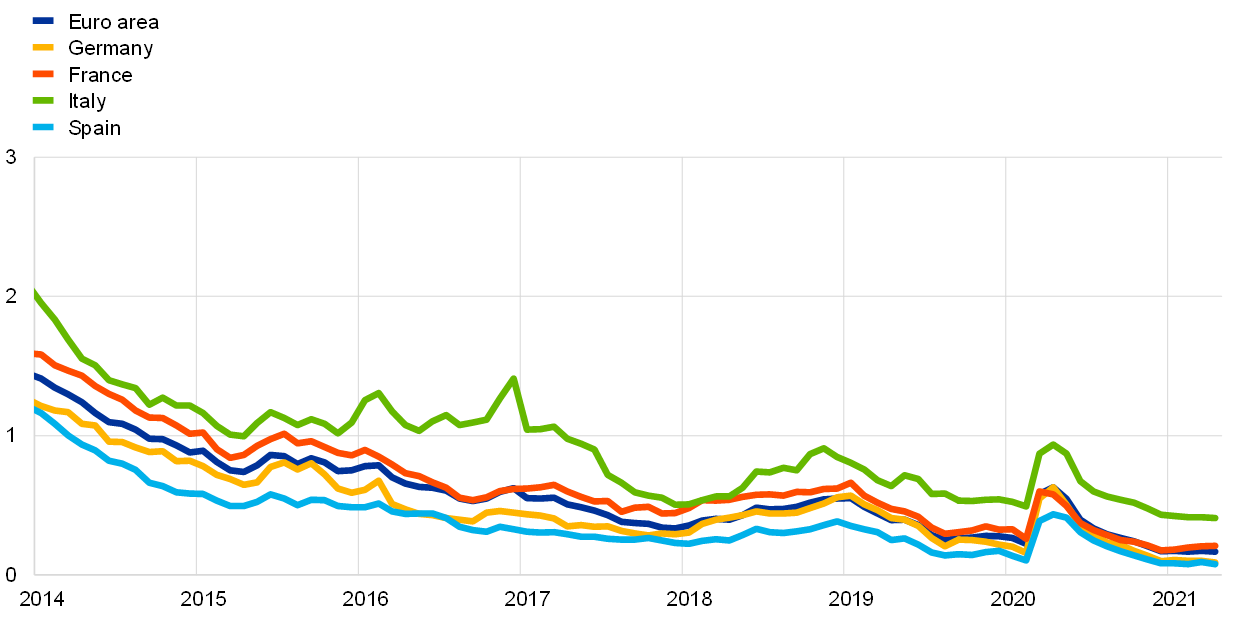 Notes: The composite cost of deposits is calculated as the average of new business rates on overnight deposits, deposits with an agreed maturity and deposits redeemable at notice, weighted by their respective outstanding amounts. The latest observations are for April 2021.