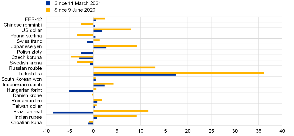 Notes: EER-42 is the nominal effective exchange rate of the euro against the currencies of 42 of the euro area’s most important trading partners. A positive (negative) change corresponds to an appreciation (depreciation) of the euro. All changes have been calculated using the foreign exchange rates prevailing on 9 June 2021.