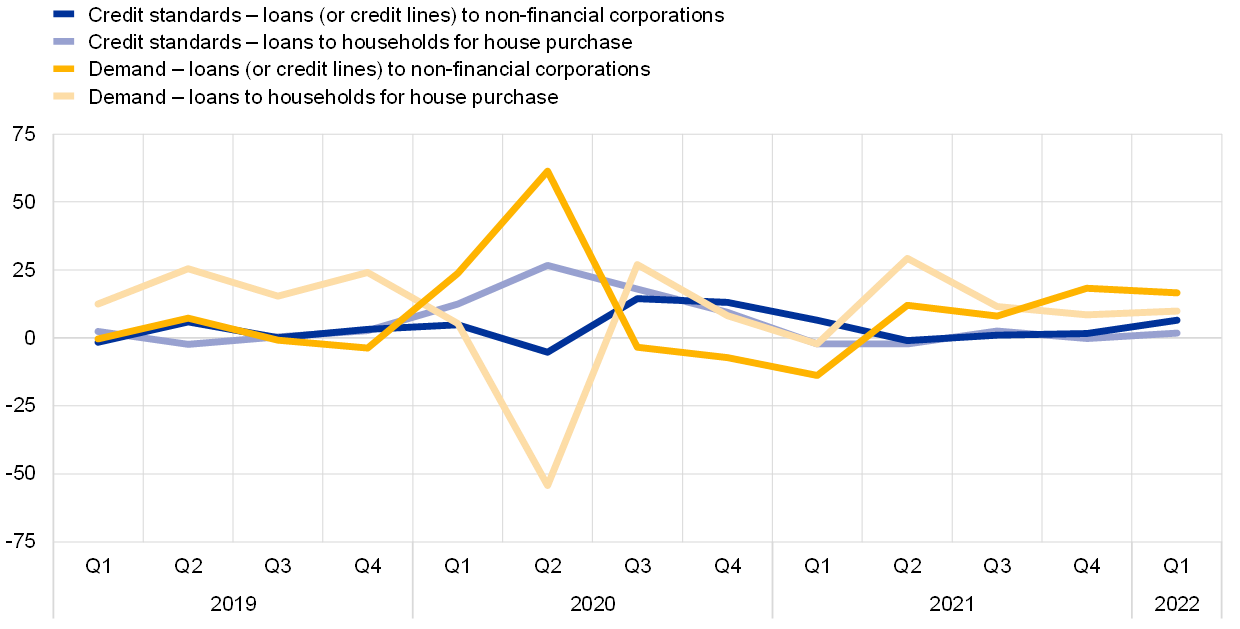 Notes: For survey questions on credit standards, “net percentages” are defined as the difference between the sum of the percentages of banks responding “tightened considerably” and “tightened somewhat” and the sum of the percentages of banks responding “eased somewhat” and “eased considerably”. For survey questions on demand for loans, “net percentages” are defined as the difference between the sum of the percentages of banks responding “increased considerably” and “increased somewhat” and the sum of the percentages of banks responding “decreased somewhat” and “decreased considerably”. The latest observations are for the first quarter of 2022.