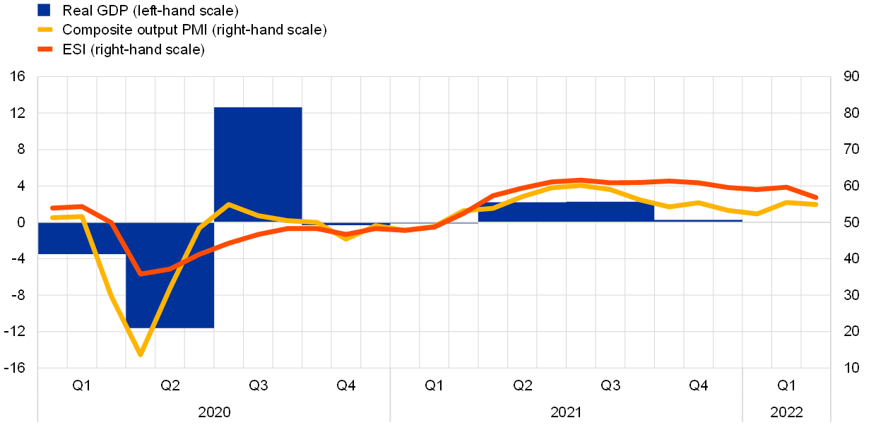 Notes: The two lines indicate monthly developments; the bars show quarterly data. The European Commission’s Economic Sentiment Indicator (ESI) has been standardised and rescaled so that it has the same mean and standard deviation as the Purchasing Managers’ Index (PMI). The latest observations are for the fourth quarter of 2021 for real GDP and March 2022 for the PMI and the ESI.
