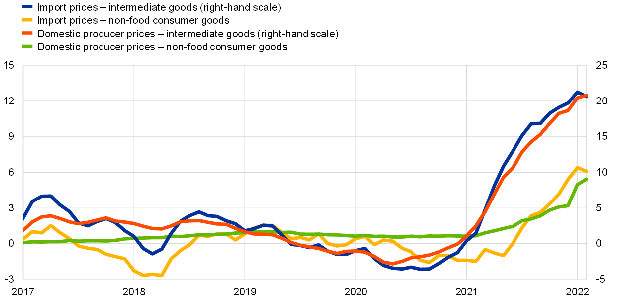 According to Eurostat’s flash estimate, HICP inflation saw a further sharp increase to 7.5% in March 2022 (Chart 6). This strong rise of 1.6 percentage points since February partially reflected the impact of the war in Ukraine. In this respect, the increase in headline inflation was predominantly driven by elevated energy prices, although food inflation and HICP inflation excluding energy and food (HICPX) also rose. HICPX growth was 3.0% in March, reflecting the dynamics of both service prices and non-energy industrial goods prices.