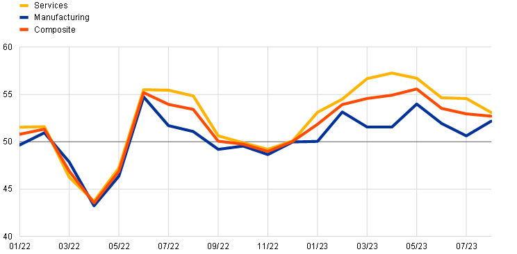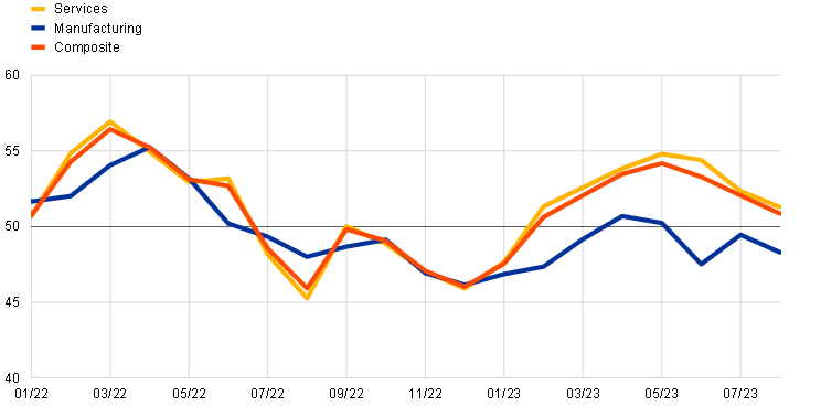 Short-term labour market indicators suggest a further slowdown in employment growth in the third quarter of 2023. The monthly composite PMI employment indicator declined from 51.4 in July to 50.2 in August; a value below the threshold of 50 indicates a decrease in employment. This indicator has declined substantially since April, when it reached 54.5. The recent decline has been sharper in the services sectors but the PMI remains in expansionary territory, while manufacturing and construction are below the 50 threshold. Among the services sectors, there was a larger decline in those more closely linked to manufacturing activity, such as transport and professional services.