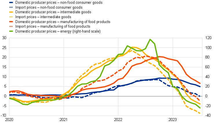 Crude oil prices are higher than in the June projections, following Saudi Arabia and Russia’s agreement to extend their production cuts. In early September, Saudi Arabia and Russia extended their one-month production cuts to the rest of 2023. The production cuts correspond to around 1.3% of global supply and add to previously agreed production cuts in the OPEC+ group and further tighten the oil market which, according to the International Energy Agency, is now in a deficit of supply. The effects of the supply cuts acted as a counterweight to weaker demand in China. European gas prices have shown some volatility amid supply shortages, related to outages in Norway and more recently to strikes at liquified natural gas terminals in Australia, but declined since the June projections, as the EU reached its 90% storage target three months ahead of schedule. While this implies that risks to supply in the short term remain limited, they cannot be ruled out fully because there may be supply outages for a prolonged period. In general, the European gas market remains very sensitive to supply disruptions, as recently illustrated by price volatility caused by outages and strikes.