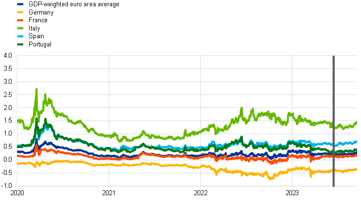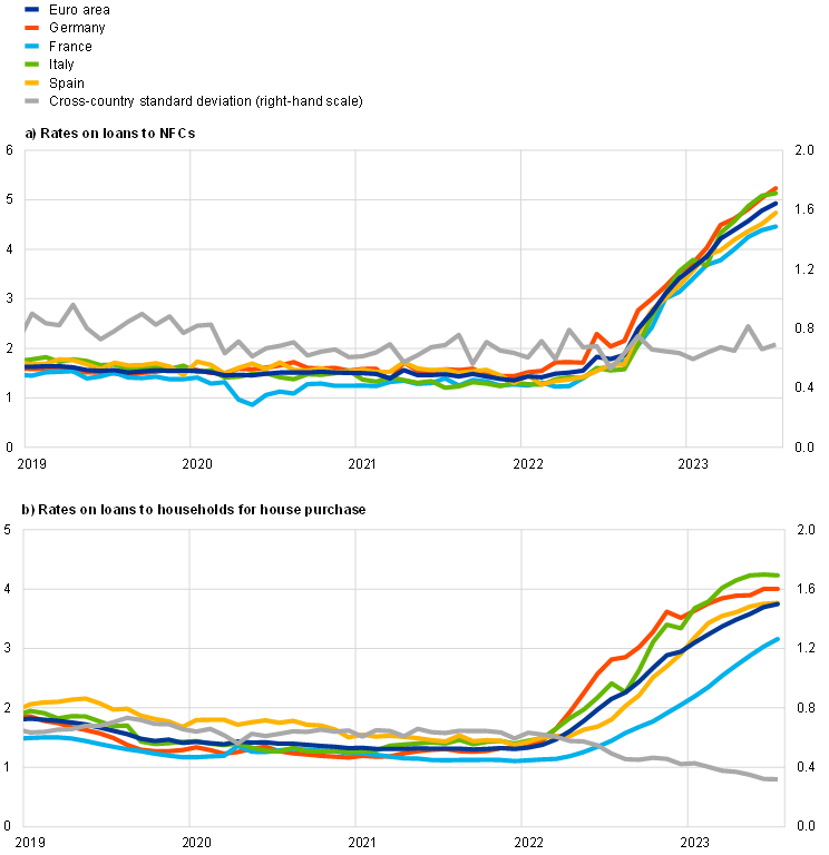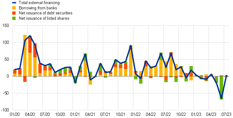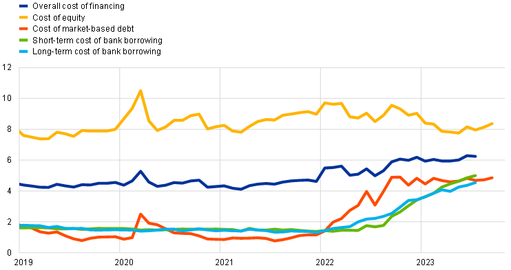 13. Owing to lags in the data available on the cost of borrowing from banks, data on the overall cost of financing for NFCs are only available up to July 2023.