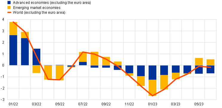 World trade growth is expected to remain weak this year and recover gradually thereafter. Sluggish global trade this year contrasts with relatively resilient global activity. Global imports are projected to grow only marginally this year (+0.2%) because imports across advanced economies are expected to contract, reflecting weak demand resulting from tighter financial conditions and composition effects related, in part, to the post-pandemic recovery. Three compounding compositional effects continue to explain weak trade in 2023, as activity is being driven by less trade-intensive geographies (emerging economies), demand components (consumption) and products (services). However, the weakness in global trade has bottomed out and momentum is expected to gradually improve in the remainder of 2023. This is in line with the latest data for global trade in goods (Chart 2) and also reflects the strong post-pandemic recovery in services trade, such as tourism. For the period 2024-25, global trade is projected to regain some further momentum, and to grow more in line with real GDP, expanding by 3.2% in 2024 and 3.3% in 2025. Euro area foreign demand growth is projected to remain flat this year and to increase by 3% annually over the period 2024-25. Compared with the June 2023 projections, both world imports and euro area foreign demand growth have been revised downwards in 2023 (by 1.1 percentage points and 0.4 percentage points respectively), largely on account of further downward revisions to historical data at the turn of the year and weaker than previously estimated imports in the second quarter at the cut-off date for the projections. For 2024 and 2025, downward revisions are smaller, amounting to around 0.1 percentage points per year.