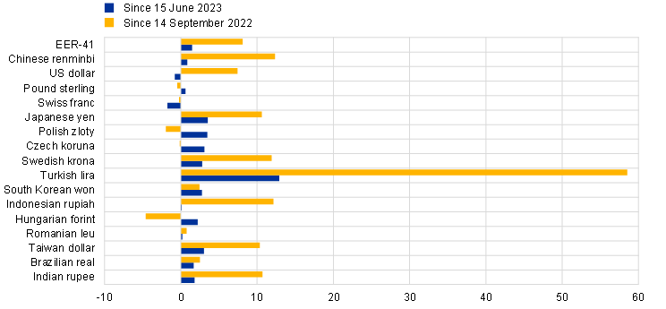 Global financial conditions tightened slightly across advanced and emerging market economies. In the United States, the modest tightening of financial conditions mainly reflected an increase in long-term sovereign bond yields and an appreciation in the US dollar nominal effective exchange rate, which was partly offset by favourable risk sentiment in the domestic corporate bond market. These developments took place against a background of positive macroeconomic surprises and a further easing in inflationary pressures. Financial conditions also tightened slightly in other advanced and emerging market economies, mostly reflecting higher long-term interest rates. In emerging markets, domestic currencies that are weaker against the US dollar also contributed somewhat to tighter financial conditions, as early and aggressive interest rate hikes in some countries allowed their central banks to pause and, in some cases, to cut policy rates, while sovereign spreads and equity valuations remained stable.