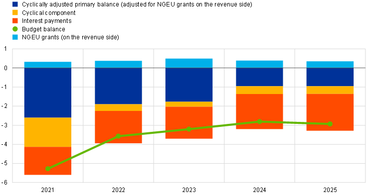 16. The fiscal stance reflects the direction and size of the stimulus from fiscal policies to the economy beyond the automatic reaction of public finances to the business cycle. It is measured here as the change in the cyclically adjusted primary balance ratio net of government support to the financial sector. Given that the higher budget revenues related to NGEU grants from the EU budget do not have a contractionary impact on demand, in this context, the cyclically adjusted primary balance is adjusted to exclude those revenues. For more details on the euro area fiscal stance, see the article entitled “The euro area fiscal stance”, Economic Bulletin, Issue 4, ECB, 2016.