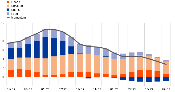 Inflation excluding energy and food fell to 5.3% in August, from 5.5% in July. Goods inflation declined to 4.8% in August, from 5.0% in July and 5.5% in June, owing to better supply conditions, previous drops in energy prices, easing price pressures in the earlier stages of the production chain and weaker demand. Services inflation edged down to 5.5% but was still kept up by strong spending on holidays and travel and by the high growth of wages. The annual growth rate of compensation per employee remained constant at 5.5% in the second quarter of the year. The contribution of labour costs to annual domestic inflation increased in the second quarter, in part owing to weaker productivity, while the contribution of profits fell for the first time since early 2022.