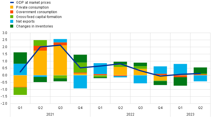 The euro area economy grew by 0.1% in the second quarter of 2023, amid large variations between countries. The positive contributions of inventory accumulation and, to a lesser extent, of domestic demand were partly offset by a negative net trade contribution (Chart 4). This modest growth in activity reflects divergent dynamics across sectors: services activity grew, while manufacturing and construction activity declined. It also masked considerable divergence across the largest euro area countries, reflecting the varying extent to which these were affected by the slowdown in the global trade of goods and by the recovery of the contact-intensive services sector. Quarter on quarter, GDP increased by 0.5% in France and by 0.4% in Spain, while it remained unchanged in Germany and decreased by 0.4% in Italy and by 0.3% in the Netherlands.