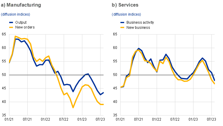 Activity in the third quarter of 2023 is expected to remain weak. Incoming survey data point to subdued economic growth in the third quarter of 2023, driven not only by a continued weakness in manufacturing activity, but also by a deceleration in services, which had previously shown resilience. The composite output Purchasing Managers’ Index (PMI) for the euro area continued to fall further below the growth threshold of 50 in July and August. The PMI for manufacturing remained in contractionary territory, as the support from the improvement of supply chain conditions has run its course, backlogs of work are easing and new orders are falling (Chart 5, panel a). However, in recent months the weakness spread to the services sector, with the PMI for services activity dropping below the zero-growth threshold in August (Chart 5, panel b). This outcome reflects the fading effect of the post-pandemic reopening on services demand, which was, until recently, a significant driver of the growth differential between manufacturing and contact-intensive services.[4] The European Commission’s Economic Sentiment Indicator declined further in August across sectors, pointing to a clear weakening in growth dynamics in the third quarter. Consumer confidence declined slightly in August, interrupting the recovery that started in late 2022, and stands well below its long-term average. This suggests a weak outlook for domestic demand. Overall, the recent indicators suggest that GDP growth remains weak in the third quarter, as the subdued foreign demand and the tightening financing conditions are expected to weigh on economic growth in the euro area.