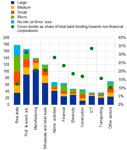 The cross-border lending market is quite competitive for banks domiciled in large euro area economies, while borrowers are concentrated in only a few sectors.[8] A larger number of German and French lenders are involved in cross-border lending than is the case for banks in the Netherlands and Luxembourg (Chart C, panel a). The real estate sector is the one that benefits most from cross-border lending in terms of lending volumes, with lending evenly spread across different sizes of firm. Other borrowers are mainly large firms involved in manufacturing, professional and scientific activities, as well as in wholesale and retail trade. Services sector borrowers (e.g. from the ICT or professional science activities sectors) are the largest cross-border lending beneficiaries in relative terms (Chart C, panel b).