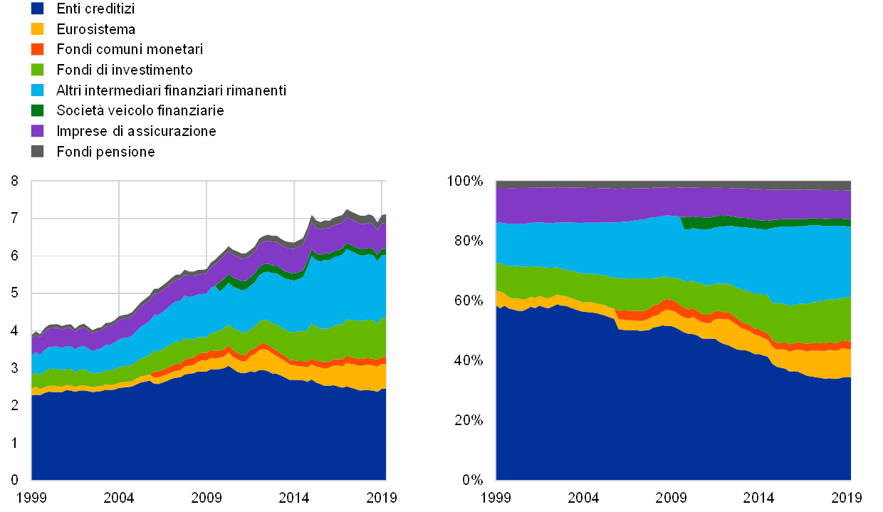 Fonte: BCE.Note: nelle attività aggregate (non consolidate) dei sottosettori rientrano le attività finanziarie, mentre sono escluse le attività non finanziarie. Gli AIF rimanenti comprendono operatori in valori mobiliari e strumenti derivati, società finanziarie erogatrici di prestiti (società di leasing o factoring), società finanziarie specializzate (incluse società di venture capital, società di finanziamento delle esportazioni e delle importazioni o alcune controparti centrali), ausiliari finanziari (inclusi ad esempio società di gestione patrimoniale, broker in valori mobiliari, consulenti di investimenti, broker di assicurazione o borse), nonché istituzioni finanziarie captive e prestatori di fondi (inclusi ad esempio società di partecipazione finanziaria, veicoli di finanziamento di società non finanziarie, che fra l’altro ne supportano le emissioni di titoli di debito, e altri soggetti che convogliano flussi finanziari all’interno di società non finanziarie). I dati sui fondi comuni monetari sono riportati separatamente dagli enti creditizi solo dal 1° trim. 2006. I dati sulle società veicolo finanziarie, che svolgono operazioni di cartolarizzazione, sono rilevate separatamente dagli AIF rimanenti a partire dal 4° trim. 2009.