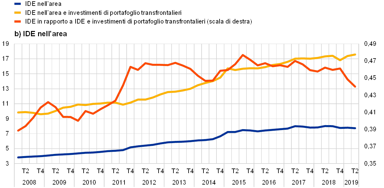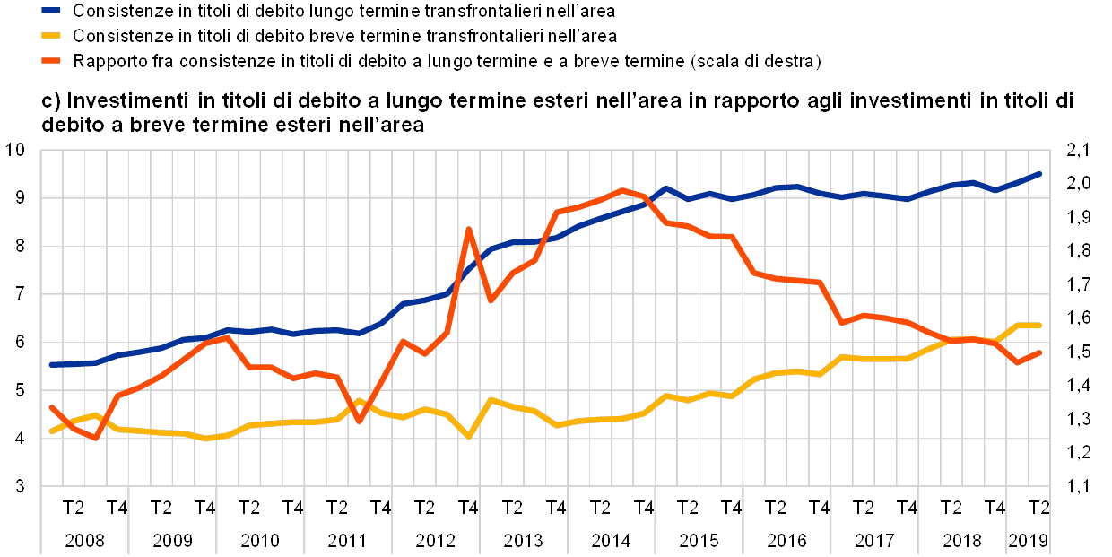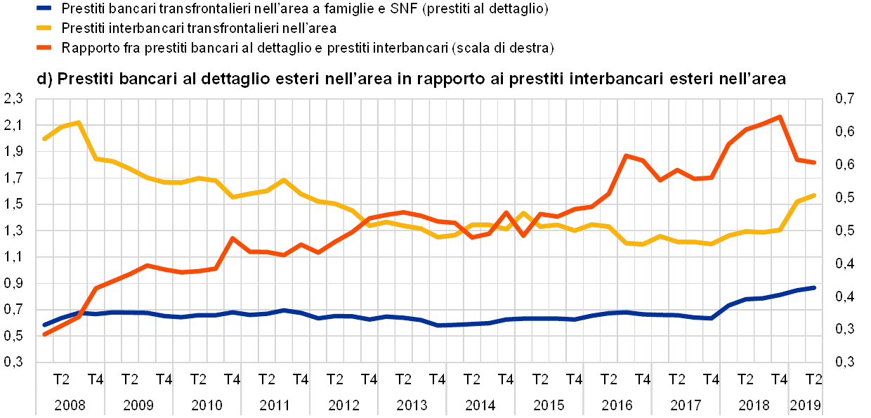 Fonti: (a) BCE ed elaborazioni della BCE; (b) BCE; (c) BCE, elaborazioni della BCE basate sui dati della bilancia dei pagamenti ed Eurostat; (d) BCE.Note: (a) la linea blu mostra il volume totale delle consistenze in capitale di rischio detenute dagli investitori dell’area dell’euro (tutti i settori) emesse da residenti di altri paesi dell’area. La linea gialla mostra il volume totale delle consistenze in titoli di debito detenute dagli investitori dell’area dell’euro (tutti i settori) emesse da residenti di altri paesi dell’area. La linea arancione mostra il rapporto tra i due aggregati. Per gli investimenti in capitale di rischio e in strumenti di debito il totale si riferisce alla somma delle consistenze di attività transfrontaliere e nazionali nell’area dell’euro. (b) La linea blu mostra il volume totale degli IDE nell’area dell’euro. La linea gialla mostra la somma degli IDE e degli investimenti di portafoglio transfrontalieri nell’area dell’euro. La linea arancione mostra il rapporto tra i due aggregati. (c) La linea blu mostra il volume totale degli strumenti di debito a lungo termine (con scadenza superiore a un anno) emessi dai paesi dell’area dell’euro e detenuti da residenti di altri paesi dell’area. La linea gialla mostra il volume totale degli strumenti di debito a breve termine (con scadenza inferiore a un anno) emessi dai paesi dell’area dell’euro e detenuti da residenti di altri paesi dell’area. La linea arancione mostra il rapporto tra i due aggregati. (d) La linea blu mostra il volume totale dei prestiti bancari transfrontalieri nell’area dell’euro a famiglie e SNF, ossia prestiti bancari al dettaglio. La linea gialla mostra il volume totale dei prestiti transfrontalieri tra le IFM nell’area dell’euro, ossia i prestiti interbancari. La linea arancione mostra il rapporto tra i due aggregati. Una trattazione più dettagliata sull’interpretazione di questi indicatori è consultabile nel modulo A “Financial integration and risk sharing in a monetary union” del rapporto “Financial integration in Europe” della BCE del 2016.