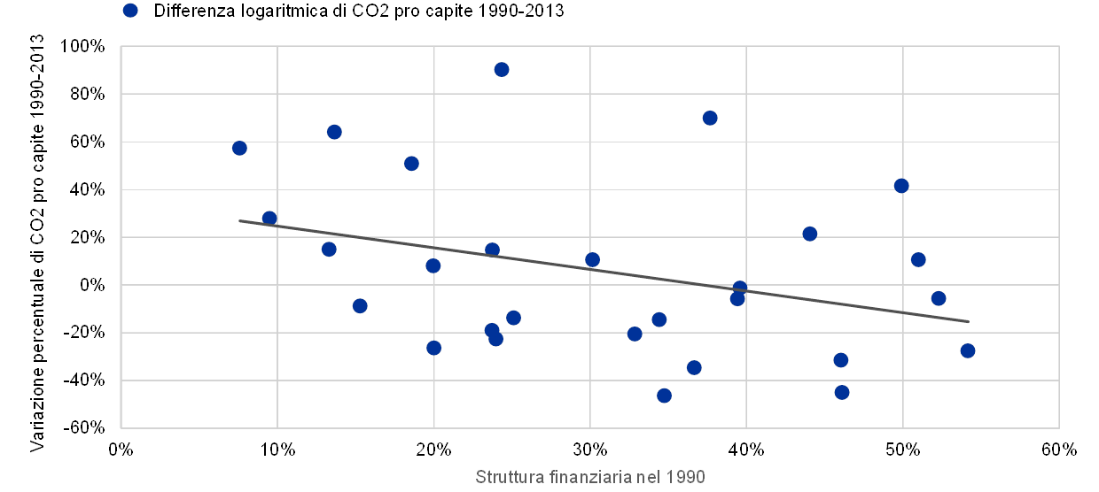 Fonti: i dati sulle emissioni di carbonio (migliaia di tonnellate di CO2 pro capite) sono elaborati dalla International Energy Association; i dati relativi al credito al settore privato e alla capitalizzazione del mercato azionario sono tratti dal Financial Structure Database della Banca mondiale.Note: la “struttura finanziaria nel 1990” è definita come la capitalizzazione totale del mercato azionario divisa per la somma del credito totale al settore privato e della capitalizzazione totale del mercato azionario per 100, per ciascun paese, nel 1990; i punti del grafico corrispondono a 28 paesi dell’OCSE.