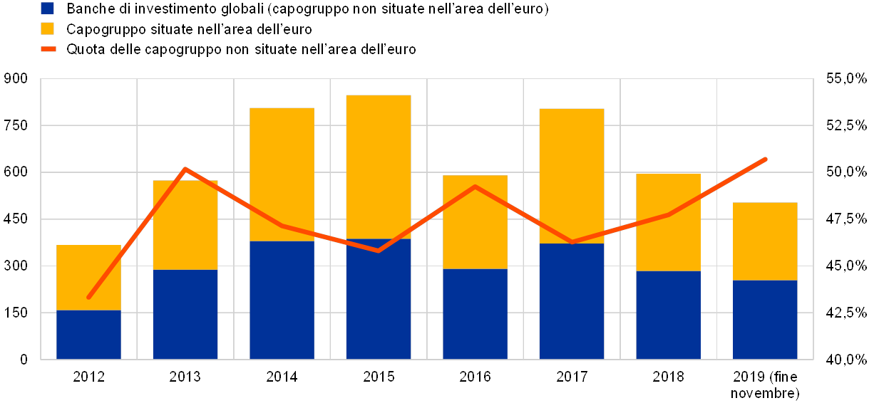 Fonte: Dealogic.Note: le banche coinvolte in operazioni in qualità di gestore, gestore congiunto, bookrunner, partecipante o sottoscrittore sono classificate come “area dell’euro” o “globale” a seconda dell’ubicazione della capogruppo. Prima della Brexit le banche globali accedevano generalmente al mercato da Londra. Le colonne mostrano il numero di operazioni a cui hanno partecipato le singole banche. Dal momento che numerose banche partecipano normalmente a un’unica operazione, ciò può comportare qualche doppio conteggio di operazioni sulla scala di sinistra. La linea arancione rappresenta il rapporto tra le colonne blu e gialle e può considerarsi indicativa della rilevanza delle banche globali per il mercato dell’area dell’euro.