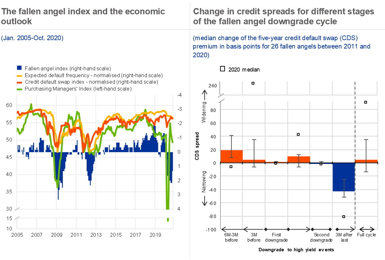 Credit rating downgrades especially from investment grade to high yield (“fallen angels”) can adversely affect the price and ease of a firm’s debt issuance. Credit rating agencies (CRAs) assess whether an issuer and its debt are relatively safe “investment grade” (rated BBB- or above) or more risky “high yield” (rated BB+ or below). In this context, a fallen angel is generally understood to be an issuer that has been downgraded from investment grade to high yield by at least one of the three major CRAs. Such a downgrade can force (institutional) investors to sell securities, as investment mandates may restrict the securities that they are allowed to hold.[1] It may also trigger a sharp increase in a firm’s cost of bond financing and reduce its market access. This box considers the prospects for fallen angels, and assesses whether the consequences for market access and the risk of downgrade-linked sell-offs are as great as sometimes feared.