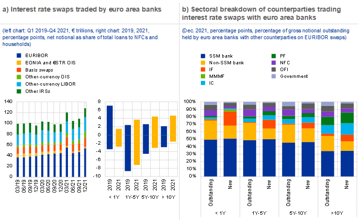 Notes: Panel a: “Basis swaps” are IRS on floating interest rates, “EONIA and €STR OIS” are euro-denominated overnight index swaps, “Other-currency OIS” are overnight index swaps denominated in other currencies, “Other-currency LIBOR” includes GBP-, JPY-, CHF- and USD-denominated LIBOR swaps, “Other IRSs” includes fixed-to-fixed swaps, inflation swaps and other IRS. Right chart: net notional is aggregated in four maturity buckets. “NFCs” stands for non-financial corporations and “IRS” for interest rate swaps. Panel b: outstanding trades excluding intragroup transactions. Outstanding refers to outstanding contracts as of 31 December 2021, new refers to IRS trades initiated following March 2021. Trades with NCBs and counterparties with non-identifiable sectors are excluded and represent less than 2% of gross notional traded by euro area banks. Breakdown by sector: “IF” stands for investment funds, “MMMF” for money market mutual funds, “IC” for insurance companies, “PF” for pension funds, “NFC” for non-financial corporations, “OFI” for other financial institutions.