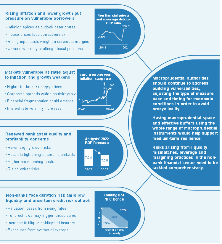 The euro area financial stability outlook has deteriorated as inflation has risen, especially since the start of the Russia-Ukraine war. Upside risks to inflation, especially from energy prices, and downside risks to growth are amplifying pre-existing vulnerabilities identified in previous issues of the FSR, such as those associated with mispricing in some financial and tangible asset markets, as well as the legacy of higher debt levels in non-financial sectors. The vulnerabilities identified could be exacerbated by shocks such as (i) a further escalation of the Russia-Ukraine war or further economic sanctions imposed in response to the war; (ii) unexpected changes in growth or inflation; or (iii) a resurgence in COVID-19 infections, with a greater economic impact than currently expected. The potential for these vulnerabilities to materialise simultaneously and possibly amplify each other further increases the medium-term risks to financial stability.