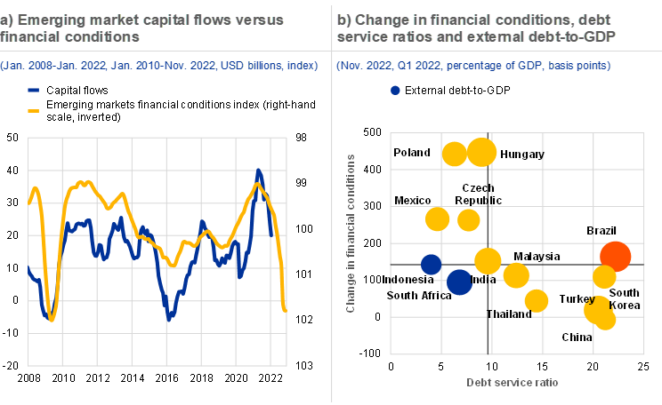 Notes: Panel a: capital flows show the sum of equity and debt capital to Turkey, South Africa, Brazil, Chile, Mexico, Lebanon, Sri Lanka, India, Malaysia, Pakistan, the Philippines, Thailand, Bulgaria, China, Ukraine, Czech Republic, Slovakia, Estonia, Latvia, Hungary, Lithuania, Mongolia, Slovenia, North Macedonia, Poland and Romania*. The financial conditions index is shown as the six-month moving average. Panel b: debt service ratio as a percentage of GDP for the private non-financial sector, see the Bank for International Settlements database for the debt service ratios of the private non-financial sector. Orange bubbles reflect changes in financial conditions or debt service ratio above the median, red bubbles reflect both changes in financial conditions and debt service ratio above the median. Change in financial conditions reflect yearly change.