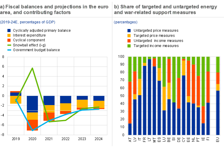 Notes: Panel a: the grey line depicts the 3% of GDP budget deficit threshold set in the Maastricht Treaty. The data refer to the aggregate general government sector of euro area countries. The fiscal stance is adjusted for the impact of Next Generation EU grants on the revenue side. The cyclical component refers to the impact of the economic cycle as well as that of temporary measures implemented by governments and includes one-off revenues and one-off capital transfers. For the snowball effect, i-g stands for interest rate-growth differential. Panel b: figures represent the shares of different types of measures in 2022 as at 31 October 2022, “price measures” are those that have a direct impact on the marginal cost of energy consumption, “income measures” are those providing temporary income support to households or (non-price) compensations to firms, “targeted” refers to measures specific to vulnerable households or firms.*