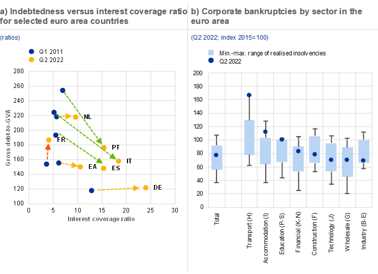 Corporate vulnerabilities are greater for energy-intensive firms which may face growing debt servicing problems. A sharper economic slowdown, together with a further tightening of financing conditions, may in particular challenge those firms that exited the pandemic with higher debt levels, more subdued earnings and lower liquidity buffers – many of which also have lower credit ratings. At the same time, higher energy and commodity prices could hurt activity in those energy-intensive sectors that are less able to pass on higher costs to customers, such as some utility and construction firms. Small and medium-sized enterprises benefited less from the post-pandemic rebound in economic activity and may be particularly vulnerable to a slowdown in economic activity and higher borrowing costs. While corporate insolvencies have remained well below their pre-pandemic levels, some sectors have already seen an increase in expected default rates (Chart 5, panel b) and might be at greater risk of insolvencies in the event of adverse economic surprises or of a further tightening of financial conditions, or both.