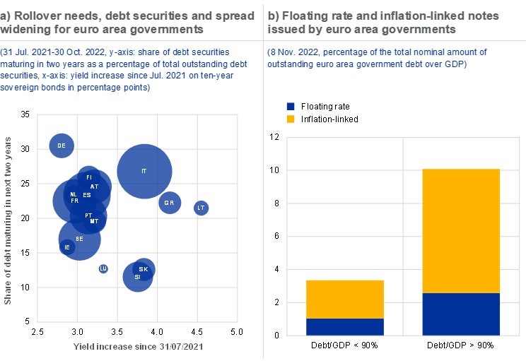 Sovereign financing conditions have tightened significantly as credit risk premia have increased. Government bond yields have increased sharply since the previous issue of the Financial Stability Review, but so far government bond spreads have moved steadily in line with risk-free rates. Moreover, measures of sovereign stress – such as the ECB Sovereign Systemic Stress Composite Indicator – have shown a significant increase, but higher-debt countries have not been any more affected than other euro area countries. At the same time, debt servicing needs remain elevated, with some euro area countries facing refinancing and interest expenditure of around 40% of GDP over the next two years (Chapter 2).[6] Moreover, the increase in interest rates is weighing more heavily on fiscal positions than previously anticipated. As such, a further deterioration in financial conditions could change market sentiment towards some of the more vulnerable euro area sovereign issuers (Box 1).