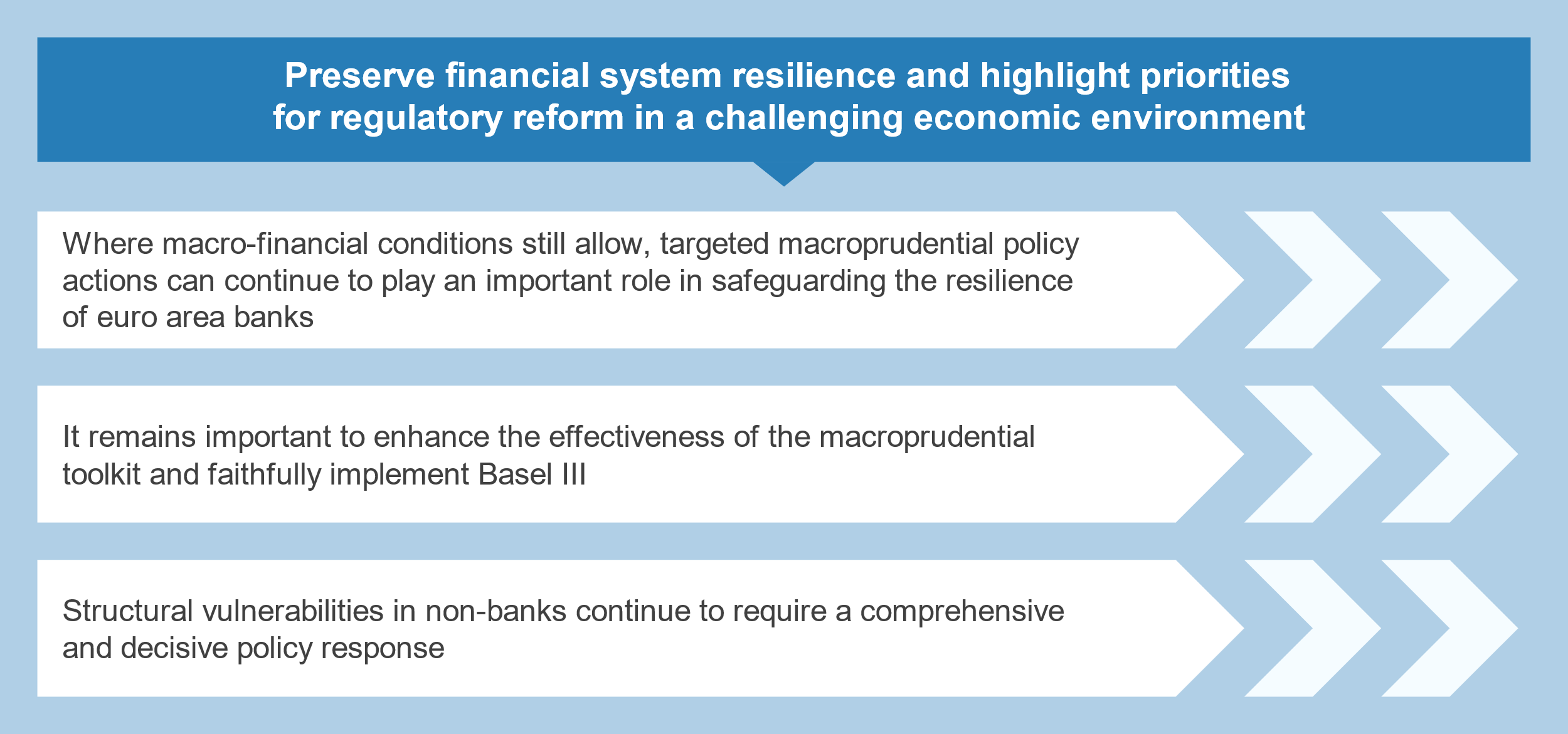 Overall, financial stability conditions have deteriorated further in the euro area since the May 2022 FSR. Upside risks to inflation, especially from energy prices, and downside risks to growth have increased and are coupled with uncertainty around the precise path for monetary policy normalisation, less fiscal space, more volatile financial markets and multiple geopolitical risks. Together, these developments amplify the risk of disorderly adjustments in financial markets and pressures in NBFIs, as well as increasing debt sustainability concerns for more-indebted households, firms and governments. These vulnerabilities could materialise simultaneously and possibly reinforce each other, increasing the risks to euro area financial stability. In this challenging environment, targeted macroprudential policy can still support banks’ resilience, while risks in the non-bank financial sector should also be addressed from a systemic perspective.