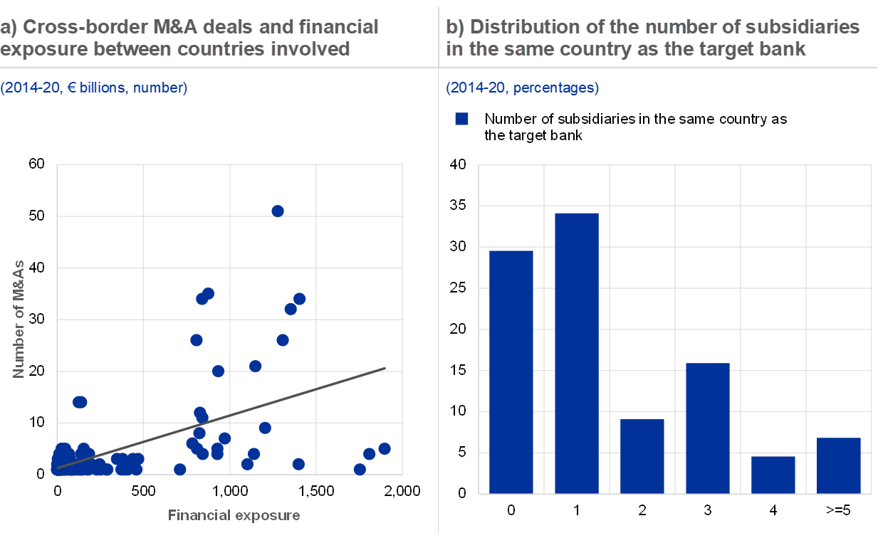 Empirical analysis shows that cross-border bank M&A transactions in the euro area tend to follow existing financial links. A gravity model was used to evaluate the determinants of M&A transactions in Europe based on data covering 385 transactions over the period from 2014 to 2020.[9] Stronger links through bilateral interbank loans and securities holdings are associated with a higher number of cross-border M&As (see Chart B.4, panel a). Banks also often tend to acquire targets in countries where they already have a physical presence through subsidiaries,[10] while entry into new countries seems relatively less frequent (see Chart B.4, panel b).