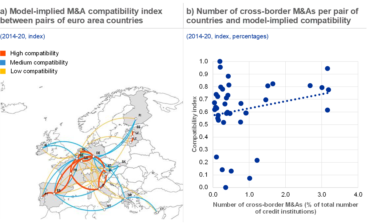 Notes: Panel a: index calculated using the coefficients of a gravity equation and averaged over 2014-20. Following the literature,[12] the gravity equation estimates, at the macro level, the impact of bilateral bank interlinkages, bilateral trade, bilateral migration, distance, common border, common language, common religion, common origin of legal system and difference of time zone on the number of bilateral M&As, using country-year fixed effects. The coefficients obtained are then used to estimate the M&A compatibility of countries and to build the index for each pair of countries. The index is scaled such that the highest compatibility has a value of one and the lowest zero. Links represent the 45 highest values in the index. The values from 1 to 15 are shown in red, from 16 to 30 in blue and from 31 to 45 in yellow. Panel b: the x-axis represents the sum of M&As by pair of countries divided by the sum of credit institutions in the two countries.