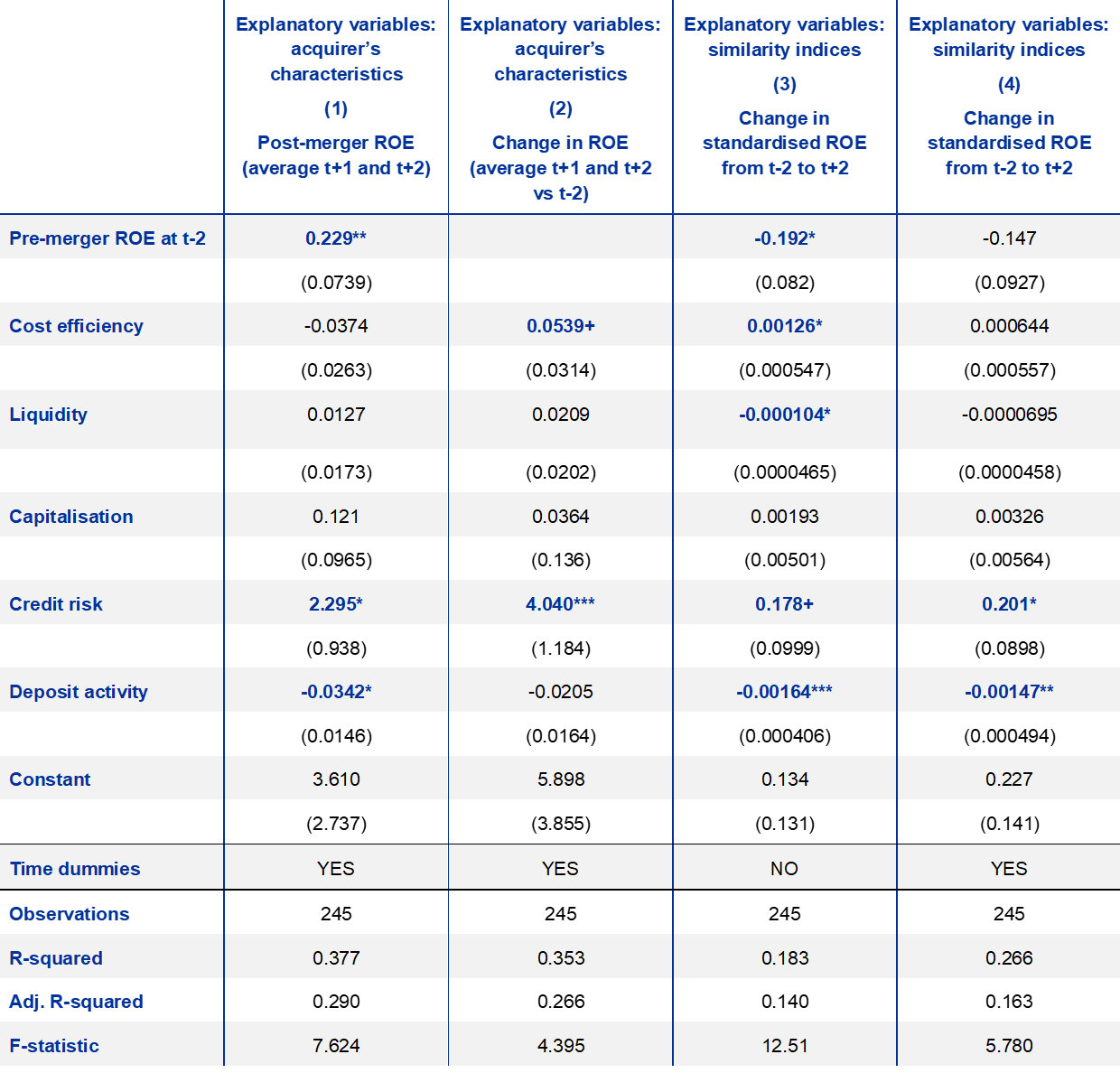 Notes: Standard errors in parentheses. Significance levels: + p<0.10, * p<0.05, ** p<0.01, *** p<0.001. In line with Beccalli and Frantz (see footnote 16), constants and dummies are interpreted as the average change in ROE following an M&A transaction. GFC: global financial crisis (see notes to Chart B.2).