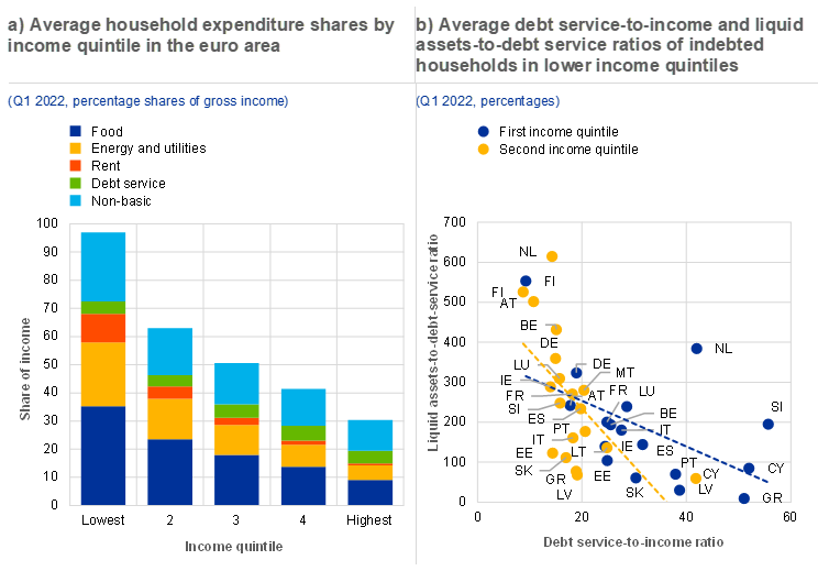 Notes: Panel a: expenditure is calculated in relation to gross income, data are extrapolated forward to the first quarter of 2022 and winsorised. Averages are equally weighted across euro area countries. Basic consumption is defined as the amount spent on food at home and utilities (e.g. electricity, gas, water, internet, TV and telephone). Non-basic consumption is defined as all expenditure on consumer goods and services excluding basic consumption. Money spent on consumer durables (e.g. cars or household appliances), the cost of insurance policies and renovation expenses is not included in non-basic consumption. Child and health care expenses are included in non-basic consumption. Not all households rent housing or have debt, meaning that the expenditure shares displayed above are averages across all households within the respective income quintiles. Reported income shares are in line with the ECB’s Consumer Expectations Survey and Eurostat’s European Union Statistics on Income and Living Conditions, while slight discrepancies may occur due to differences in samples, weighting techniques, tax deductions and the treatment of outliers. Panel b: data are extrapolated forward to the first quarter of 2022. Lithuania and Malta are excluded from the first quintile due to data limitations.