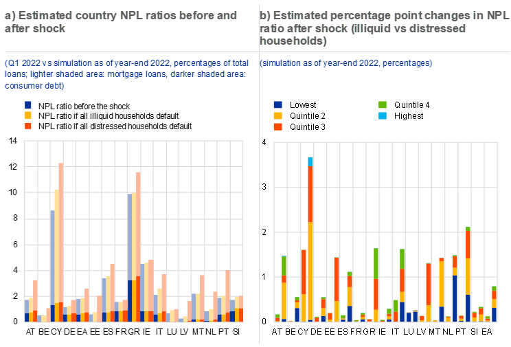 Notes: Excludes Lithuania, Slovakia and Finland due to insufficient data coverage. NPL ratios after the shock are calculated assuming that all newly illiquid/distressed households default after the shock. “Shock” refers to the impact of changes in consumer prices and interest rates on household finances between the first quarter of 2022 and the end of 2022. Panel b: for each country, the left bar represents illiquid households and the right bar distressed households.