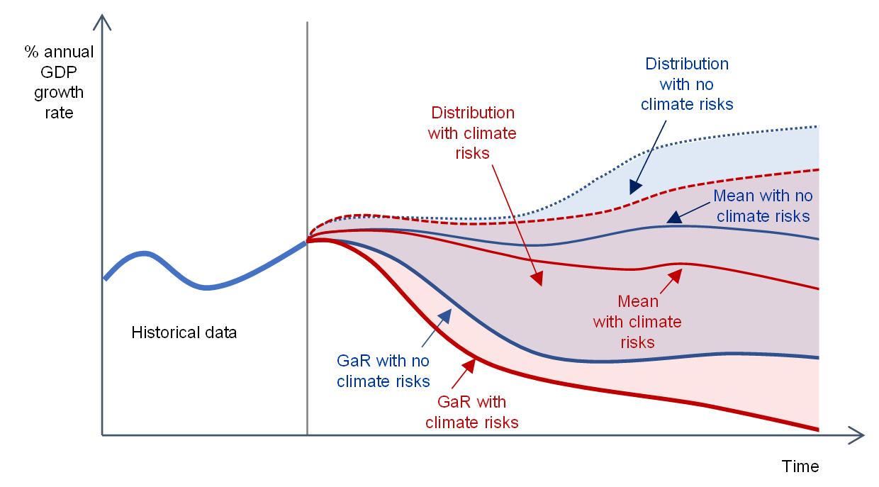 The second building block is the stochastic interpretation of long-run NGFS scenarios. Climate risks shift the long-run trajectory of economic growth. The NGFS scenarios, such as the disorderly transition or “hot house” world, focus on measuring this shift. Figure B illustrates the concept, in a stylised fashion, as the mean shift from the trajectory naively extrapolated from the past data (“mean with no climate risk”) to a growth path that accounts for the realisation of transition and physical risks (“mean with climate risk”). Even in the absence of significant interactions between climate and other macro-financial risks, climate-relevant scenarios will shift the full distribution of economic growth. This also translates into the aggravation of economic recessions, marked by the shift in the GaR, i.e. the lower percentile of the growth distribution.