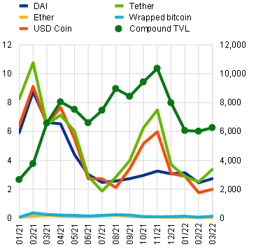Sources: Dune Analytics, The Block, DeFi Llama, DeFi Rate, IntoTheBlock and ECB calculations.