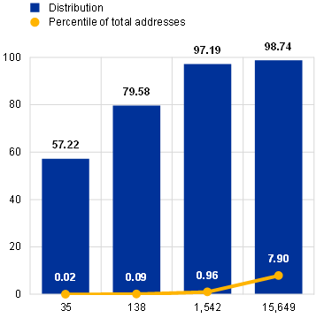 DeFi protocols or platforms claim to have a decentralised governance structure, although in reality governance is often concentrated. Decentralised governance relies on voting rights via governance tokens and decentralised autonomous organisation.[15] Governance token holders can influence the main characteristics of the protocol, such as collateral requirements and asset eligibility. While in principle governance rights/tokens can be held by many parties, at this stage governance tokens are often concentrated in the hands of developers, early investors or holders with large balances, suggesting institutional ownership.[16] For instance, 80% of the total supply in circulation of Uniswap’s governance token UNI is held by the Uniswap team, early investors and token holders with balances of over 1 million UNI.[17] Further, 1% of the total token holder addresses hold around 97% of the total governance token supply (Chart C, panel a). As such, while purportedly claimed to be decentralised, DeFi applications retain a high level of centralisation.[18]