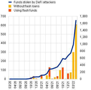 New risks inherent to DeFi, such as operational risks stemming from the underlying technology and governance risks, have risen with the expansion of DeFi. Technical and operational risks can originate from the immature and decentralised technology, in particular pertaining to the smart contracts that enable automation.[25] The vulnerability to operational risks is particularly problematic for users due to the irreversibility of transactions on the blockchain and no recourse possibilities in the absence of a central authority. Bugs within the codes (whether erroneous or intentional) can also be exploited to steal funds from participants. Alongside the recent growth of DeFi, the scale and frequency of attacks have also increased. As of March 2022, known funds stolen by DeFi attackers reached just under €1 billion, and in the same month the largest DeFi exploit to date occurred (Chart C, panel b).[26] The concentration of governance tokens and resulting power to control the conditions of a protocol give rise to governance risks.[27] There could be collusion, and other unfair practices or flaws in the governance design could be exploited to take over the protocol and its funds. For example, a DeFi project recently lost €167 million as attackers used a flash loan[28] to obtain a majority voting stake and siphoned off funds by changing the rules in their favour.[29]
