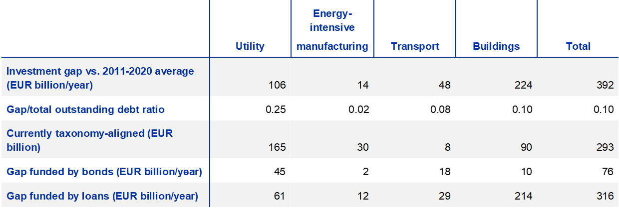 Overall, additional green bonds and loans amount to 10% of outstanding bonds and loans, with even larger growth potential for green finance in particular economic sectors.[22] Estimates show that bond issuance and borrowing could increase by as much as 25% in the utility sector owing to an increased supply of green financing instruments (see the second row in Table 1). In this sector, estimates show that only €165 billion of outstanding bonds are currently supporting green activities (see the third row in Table 1), while we will need another €106 billion each year. In the energy-intensive manufacturing sector we estimate €30 billion of taxonomy-aligned outstanding bonds, while the additional needs amount to €14 billion per year. Green financial flows are expected to grow much more in the transport (€8 billion versus €48 billion per year) and buildings (€90 billion versus €224 billion per year) sectors.