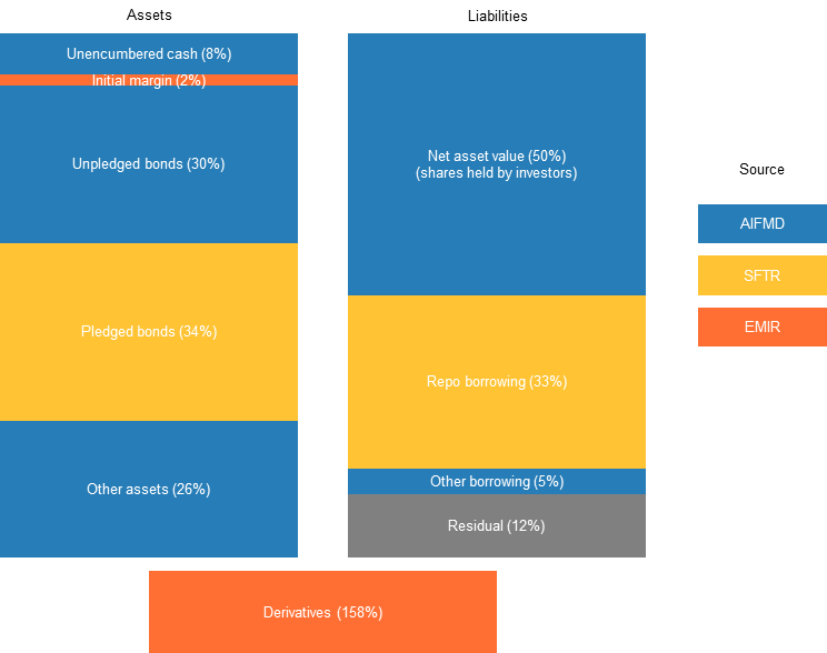 Notes: The different colours indicate the different sources of the data. Percentages refer to the value of the positions (cash, initial margin, etc.) of all leveraged AIFs compared with the sum of all assets held by these AIFs. For derivatives, the sum of exposures over total assets is displayed. SFTR and EMIR data provide transaction-level information, whereas AIFMD data only contain information on exposures at the level of asset classes. Owing to discrepancies across the three datasets, the sum of assets is not equal to the sum of liabilities. Since we average across all funds in our sample, this chart does not reflect the high degree of heterogeneity within and across fund types.