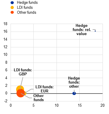 We use end-of-2023[10] data for the analysis and focus on highly leveraged EU-domiciled AIFs. We identify leveraged funds as AIFs with a gross leverage ratio (AuM/NAV) above 3.[11] The two most important groups of AIFs in the resulting sample are LDI funds[12], with an aggregate NAV of €85 billion, and hedge funds, with an NAV of €13 billion (see first section of Table 1). We distinguish between hedge funds with a relative value strategy and hedge funds with other strategies.[13] In addition, we categorise LDI funds according to their base currency, which is indicative of their geographical focus and the origin of their investors. The residual group of other leveraged AIFs is composed of fixed income funds and mixed funds.