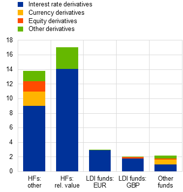 All types of leveraged AIFs have sizeable synthetic exposures, especially to interest rate derivatives, but only GBP-denominated LDI funds and hedge funds with relative value strategies use repo borrowing extensively to increase exposures. The relative importance of synthetic leverage and financial leverage through repo borrowing is illustrated in the scatter plot in panel a) of Chart 2. Panel b) disaggregates synthetic leverage by the asset class of the underlying. While LDI funds are almost exclusively exposed to interest rate derivatives, hedge funds and other AIFs are exposed to a wide range of derivatives, including currency derivatives, equity derivatives and credit derivatives.