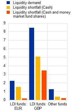 Milder shocks could still trigger liquidity issues for funds. For more than half of LDI funds, cash is not sufficient to cover margin and collateral calls in response to a 100 basis point upward shift.[17] The total liquidity shortfall is €6.6 billion and would be covered by the redemption of money market fund shares and sales of unpledged bonds (see Chart 3, panel b). Such a reaction could transmit stress to money market funds and/or to sovereign bond markets through procyclical asset sales. We find either no shortfalls or only negligible shortfalls among hedge funds and other leveraged funds.