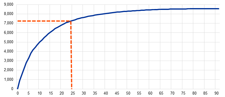 Notes: The graph is based on a sample of 90 O-SIIs in the banking union that are on their highest level of consolidation (sorted by score in descending order) and shows the cumulative distribution of about 8,500 basis points across these banks. The red dashed lines indicate that the cumulative O-SII score from the BU perspective of about 7,200 basis points for the top 24 O-SIIs captures about 72% of systemic risk in the banking union.