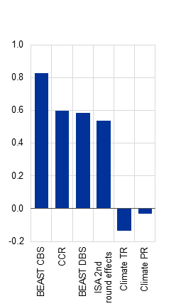 Transition and physical climate risks are assessed using top-down models that leverage the data and results submitted by banks. By combining firm-level information from the AnaCredit dataset and starting point information on banks’ probabilities of default from the EU-wide stress test, Abbondanza et al. (2025) investigate the impact on the probability of default relating to firms’ transition risk arising from green investments aimed at reducing carbon emissions. They find a moderate Common Equity Tier 1 (CET1) impact in addition to the EU-wide depletion of around 74 basis points, mostly driven by exposure to energy-intensive sectors. Focusing on flood risk, Abbondanza et al. (2025) integrate physical risk from the Nationally Determined Contributions scenario outlined by the Network for Greening the Financial System (NGFS)[3] into the EBA’s adverse scenario and estimate that banks’ credit risk losses increase by an additional 77 basis points.