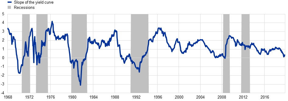 Notes: The slope of the yield curve shown is the spread between ten-year and one-year OIS yields since 1999. Before 1999, the spread is based on German bond data. German data back to 1972 are computed by the Bundesbank using the method of Svensson. German data prior to 1972 are extrapolated backwards based on historical series of short and long-term yields provided by the OECD. Long-term OECD yields refer to yields on outstanding listed federal securities with residual maturities of over nine to ten years traded on the secondary market. Short-term OECD yields are usually either the three-month interbank offered rates applicable to loans between banks, or the rates associated with Treasury bills, certificates of deposit or comparable instruments of three-month maturity in each case. Euro area (as of 1999) and German (before 1999) recessions are identified, respectively, by the CEPR and the Economic Cycle Research Institute (ECRI), with the exception of the German recession at the beginning of the 1970s identified by the OECD composite leading indicators.